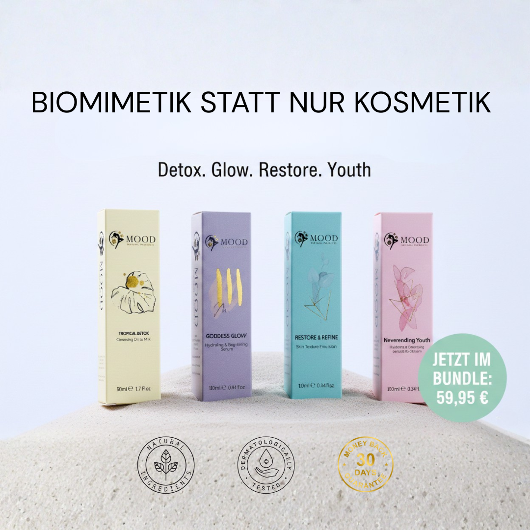 Gesunde, gepflegte Haut hingegen strahlt – mit einer Lebendigkeit, die man auf den ersten Blick erkennt. Bei MOOD Naturals setzen wir genau hier an: Mit einer durchdachten Pflege, die sich auf das Wesentliche konzentriert, alles Überflüssige weglässt und die Kraft der Natur nutzt. Während viele Hautpflegeprodukte mit aggressiven und unnötigen Ansätzen die Haut belasten, bieten wir eine kluge Alternative: